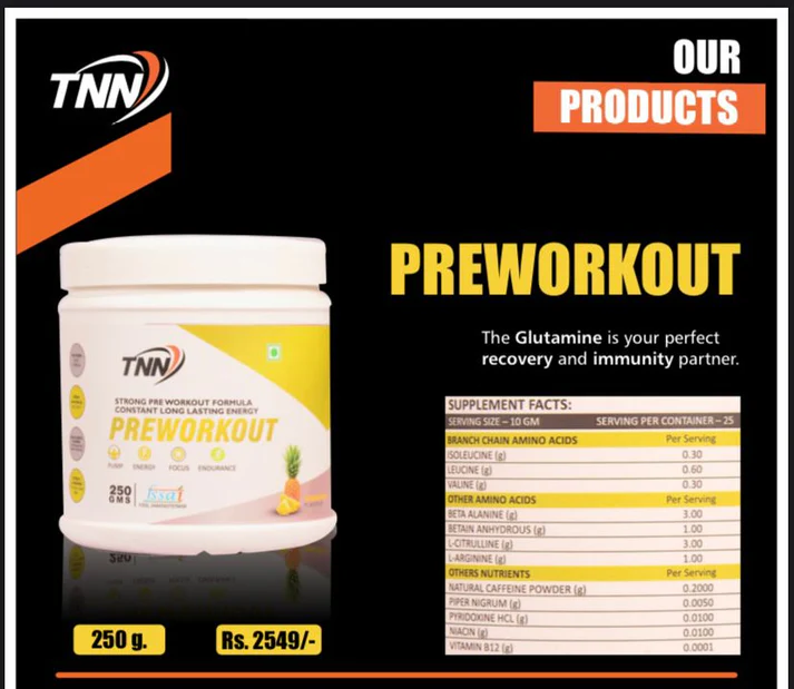 TNN Sports Pre-Workout gives you instant energy, razor-sharp focus, and unbeatable endurance. Formulated with Beta-Alanine, Caffeine, L-Citrulline, and Taurine, it helps you push harder, lift heavier, and train longer